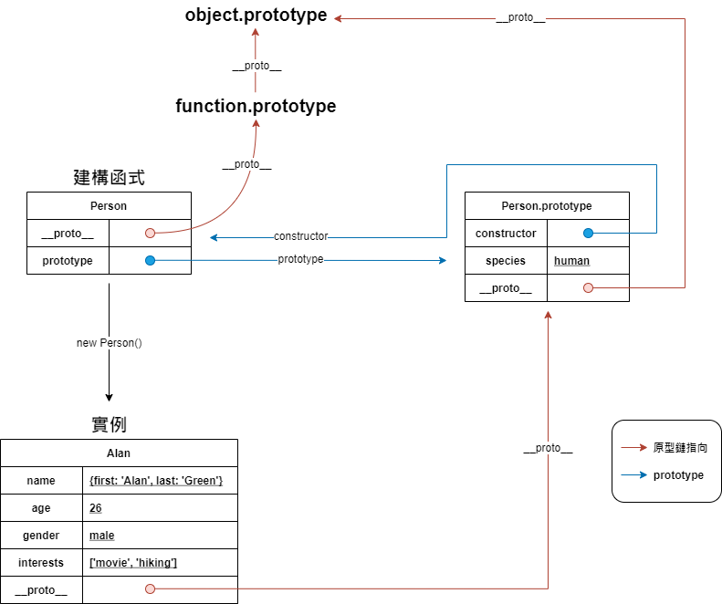 當查找物件的屬性或方法時,若本身的物件找不到時,就往更上層尋找,直到串鏈尾端。實例Alan其實是透過原型prototype才得以繼承species屬性。